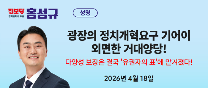 홍성규 진보당 경기도지사 후보, "정치개혁 열망 배신한 거대양당에 분노!"- 성명 내고, "기어이 외면! 다양성 보장은 결국 '유권자의 표'에 맡겨져!"홍성규 진보당 경기도지사 후보는 18일, '국회 정치개혁안 처리' 관련하여 성명을 내고 "광장의 정치개혁요구 기어이 외면한 거대양당을 강력히 규탄한다. 다양성 보장은 결국 '유권자의 표'에 맡겨졌다. 온 힘 다할 것"이라고 밝혔다.